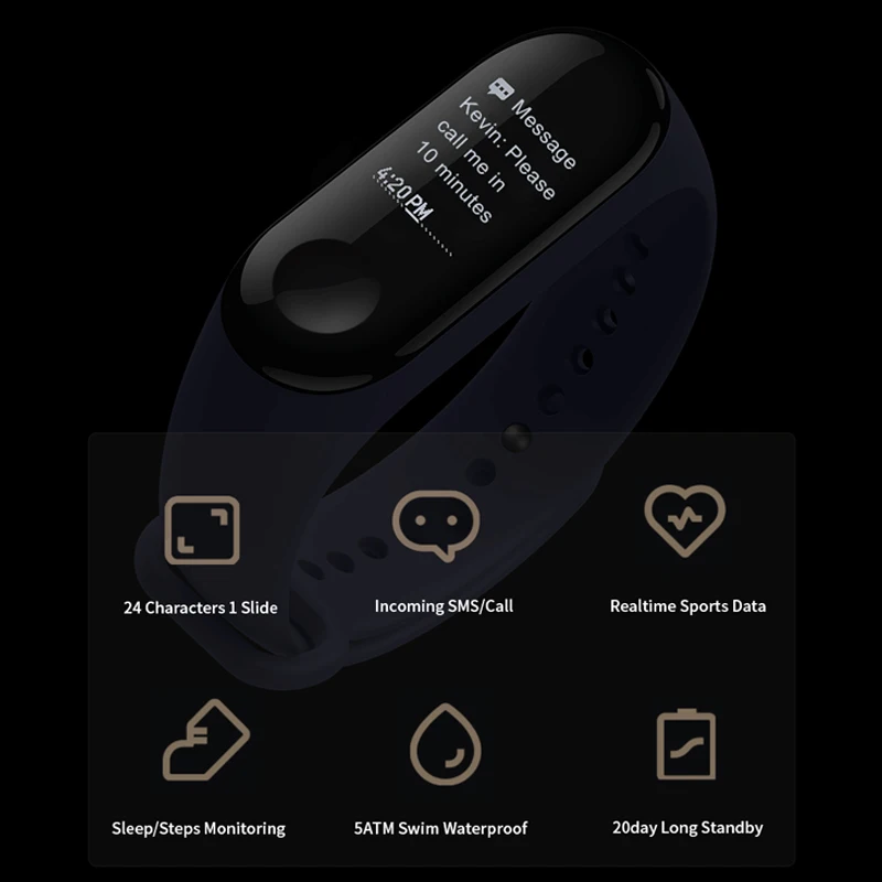 Product Name: Xiao mi mi Band 3 inteligentna opaska na rękę bransoletka fitness duży ekran dotykowy OLED wiadomość czas pracy serca Smartband hurtownie DropShipping