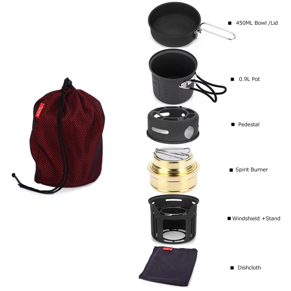 Product Name: ALOCS CW C01 zestaw 7 sztuk odkryty naczynia Camping piesze wycieczki piknik naczynie do gotowania duch kuchenka palnik na alkohol Pot miska szyby
