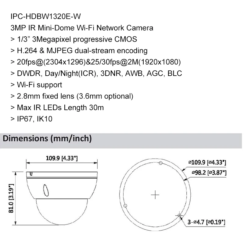 Product Name: Dahua oryginalna kamera sieciowa Wifi DH IPC HDBW1320E W 3MP bezprzewodowa karta sd bezpieczeństwo zewnętrzne Mini Dome cctv kamera na podczerwień onvif