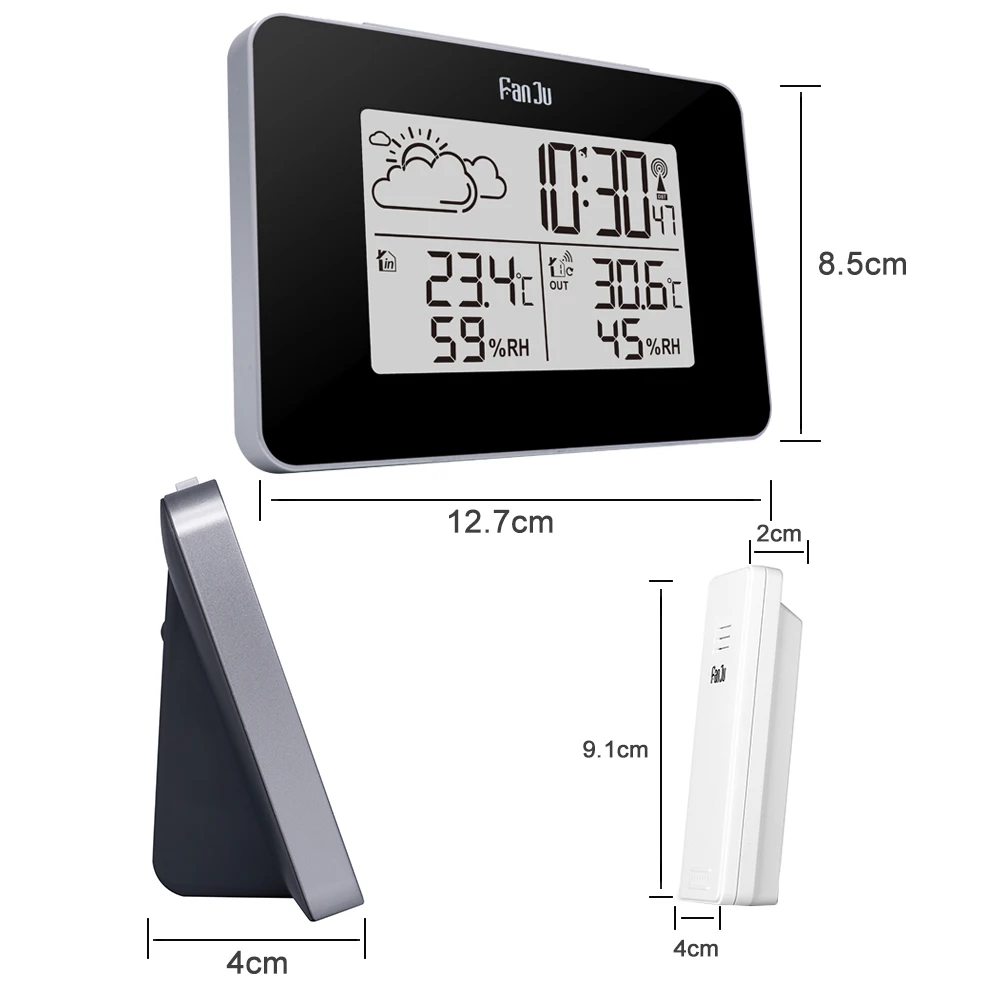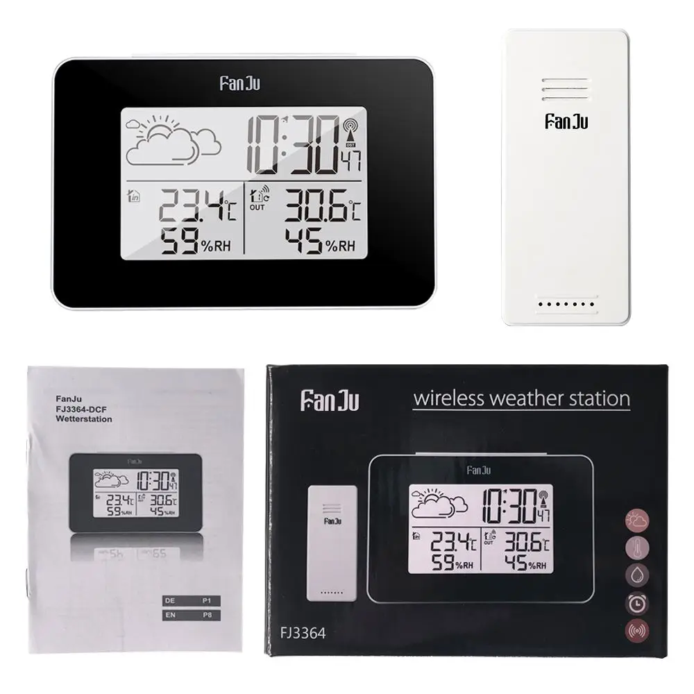 Product Name: FanJu FJ3364 cyfrowy budzik stacja pogodowa czujnik bezprzewodowy termometr higrometrowy wielofunkcyjny zegar biurkowy LED